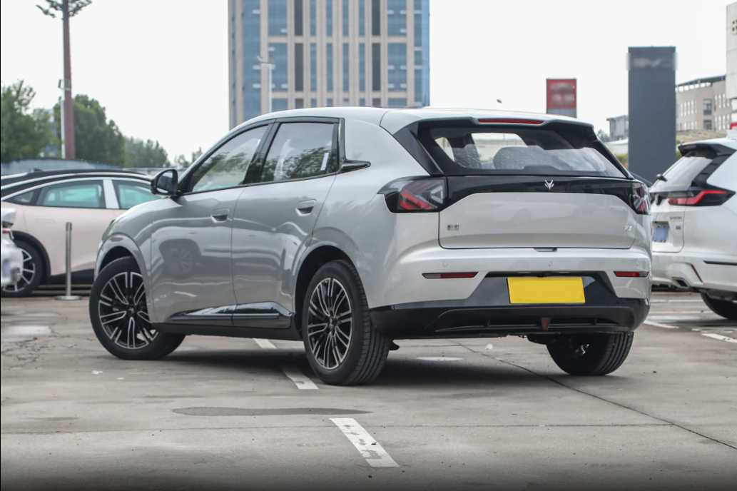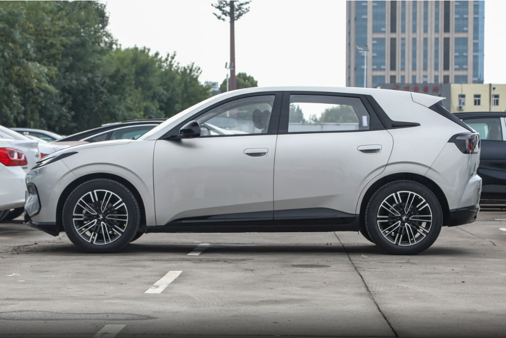 从车身侧面可以看出车辆采用短前后悬设计,为车辆带来更长的轴距,从而拥有更大的车内空间,门把手为机械的半隐藏式,用起来方便顺手。除此之外,车辆的尾部造型同样简洁,两侧灯组通过黑色装饰板连接在一起,与车头呼应,同时增加了车尾的层次,底部亮黑色装饰板还采用了类似扩散器的造型,增添了几分动感。